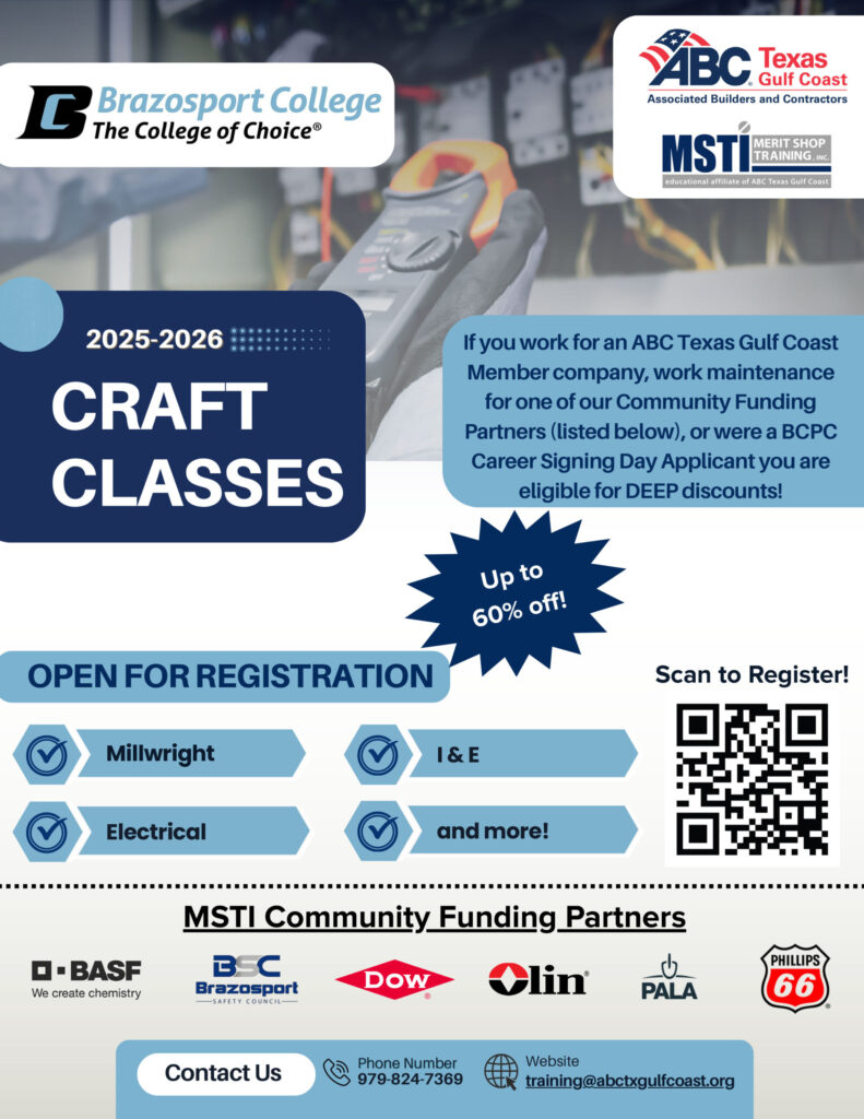 ABC Texas Gulf Coast, through its educational affiliate Merit Shop Training, Inc. (MSTI), is proud to partner with Brazosport College to offer comprehensive craft training programs in high-demand trades. This collaboration is designed to provide accessible, affordable, and industry-recognized training that prepares individuals for successful careers in the construction and industrial sectors.